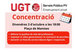 UGT ENSENYAMENT PRIVAT CONCERTAT. Concentració el divendres 3 d’octubre a les 18:00h en la Plaça de Manises