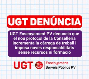 UGT Ensenyament PV denuncia que el nou protocol de la Conselleria incrementa la càrrega de treball i imposa noves responsabilitats sense recursos ni formació