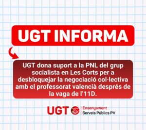 UGT dona suport a la PNL del grup socialista en Les Corts per a desbloquejar la negociació col·lectiva amb el professorat valencià després de la vaga de l’11D.