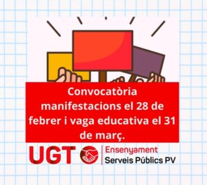 UGT, CSIF, CCOO i STEPV convoquen manifestacions el 28 de febrer i vaga educativa el 31 de març.