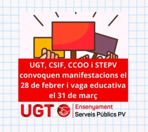 UGT, CSIF, CCOO i STEPV convoquen manifestacions el 28 de febrer i vaga educativa el 31 de març