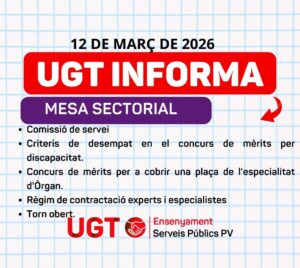 MESA SECTORIAL. 12/03/26. Comissions de servei, estabilització discapacitat, contractació experts i especialistes.