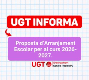 El dia 12 de març ens han convocat en Mesa Sectorial d’Educació per tractar: Si voleu fer-nos arribar diferents aportacions, podeu enviar-les al correu ensenyamentpublic@ugtserveispublicspv.org o per WhatsApp difusió 685128990 o per la resta de les nostres xarxes socials. Moltes gràcies. DOCUMENTACIÓ.