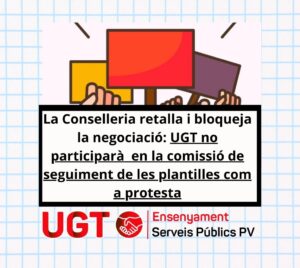 UGT Ensenyament PV denuncia la manca de negociació real de la Conselleria i no assistirà a la Comissió de Seguiment com a mesura de protesta UGT Ensenyament PV vol expressar amb contundència el seu rebuig a l’actitud de la Conselleria d’Educació, que torna a evidenciar una greu manca de respecte