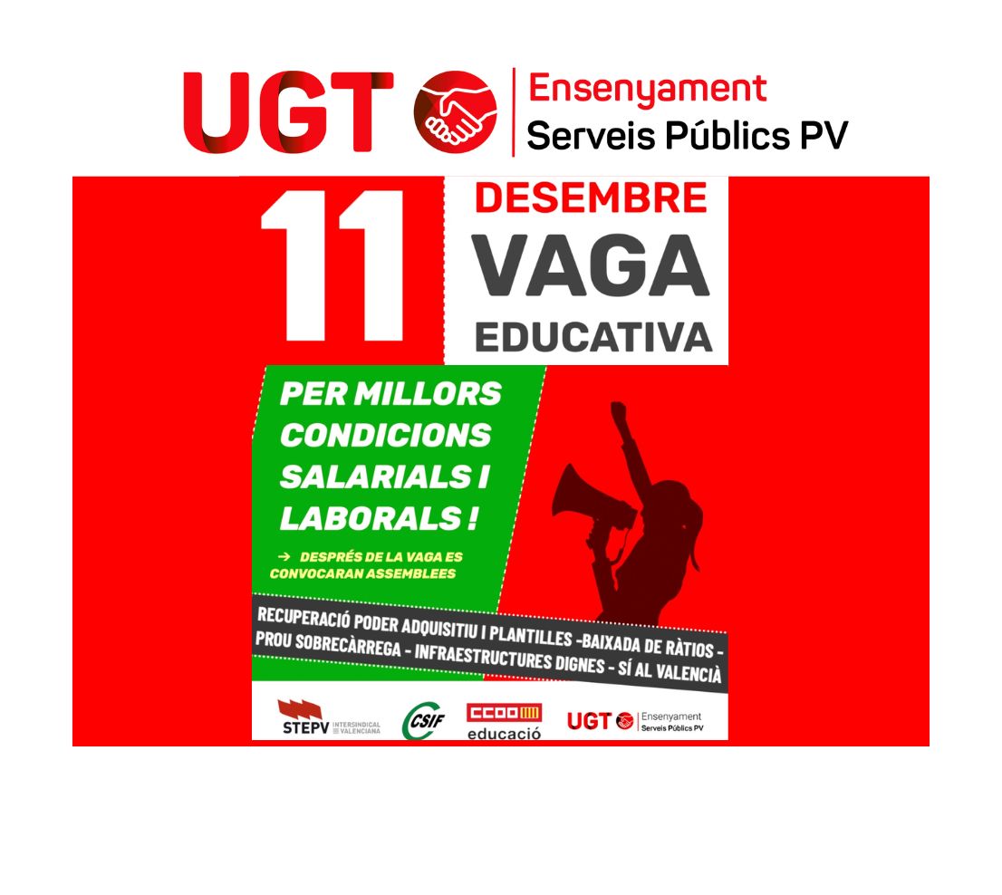 Els sindicats STEPV, CSIF, CCOO i UGT, amb el suport de la Plataforma per l’Ensenyament Públic, han convocat una vaga general educativa el pròxim 11 de desembre a tot el sistema educatiu públic no universitari del País Valencià.