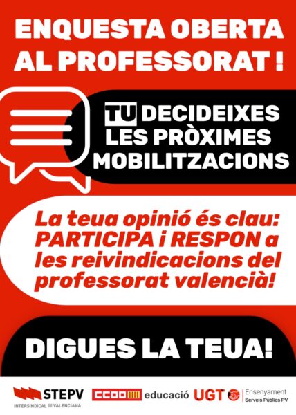 També s’ha llançat una enquesta al conjunt del professorat perquè ratifique la proposta de mobilitzacions sorgida del procés assembleari i que contempla noves convocatòries de vaga i altres accions fins el mes de maig, en què no es descarta convocar una vaga indefinida.
