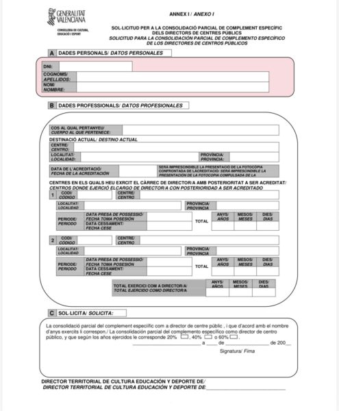 - Destinatari: La sol·licitud s’ha d’adreçar a la Direcció Territorial de Cultura, Educació i Esport de la província on estigues prestant serveis actualment.
