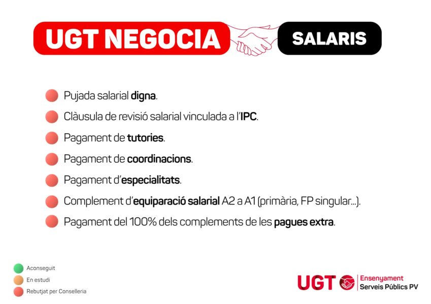 Des d’UGT exigim a la Conselleria d’Educació una proposta immediata, concreta i suficient de millora retributiva, així com un calendari clar d’aplicació que garantisca la recuperació del poder adquisitiu perdut i la dignificació de la professió docent.