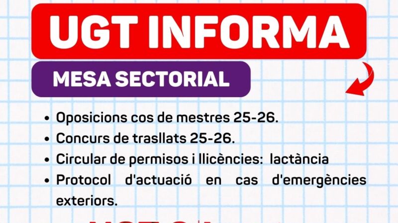 OPOSICIONS COS DE MESTRES. Orde XX/2025 de XX de *XXXXX de 2025, de la Conselleria d’Educació, Cultura, Universitats i Ocupació, per la qual es convoca procediment selectiu de concurs oposició per a l’ingrés en el Cos de Mestres i procediment per a l’adquisició de noves especialitats per personal funcionari del mateix cos. CONCURS DE TRASLLATS: … Sigue leyendo MESA SECTORIAL. 02/10/25. Oposicions cos de mestres, Concurs de trasllats, lactància i protocol emergències.