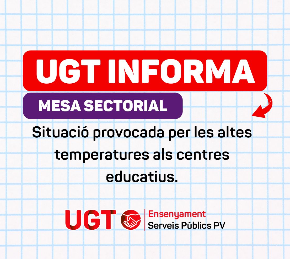 En la Mesa Sectorial del 4 de setembre relacionada amb les altes temperatures, UGT ENSENYAMENT PV ha denunciat la manca de mesures eficaces per combatre les altes temperatures que pateixen els centres educatius en aquest inici de curs i ha exigit a la Conselleria d’Educació solucions immediates i estructurals per garantir la salut de l’alumnat i del personal docent.