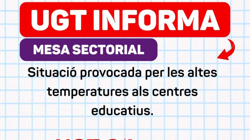 UGT Ensenyament PV reclama solucions immediates davant les altes temperatures a les aules En la Mesa Sectorial del 4 de setembre relacionada amb les altes temperatures, UGT ENSENYAMENT PV ha denunciat la manca de mesures eficaces per combatre les altes temperatures que pateixen els centres educatius en aquest inici de curs i ha exigit a … Sigue leyendo MESA SECTORIAL. 04/09/25: Situació provocada per les altes temperatures als centres educatius.