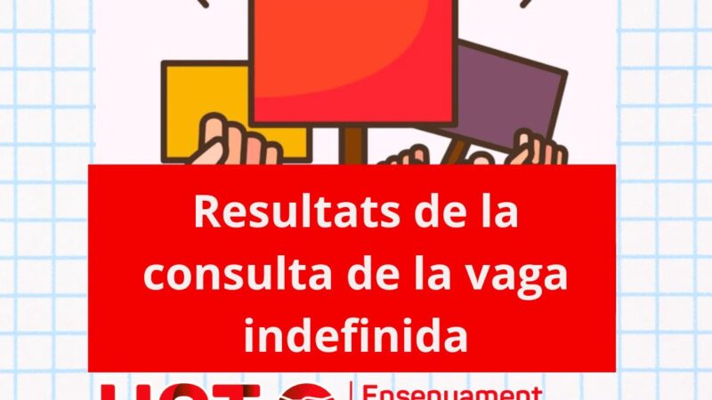 Les organitzacions que hem impulsat la consulta sobre la convocatòria de vaga indefinida entre el professorat del País Valencià volem fer públics els resultats obtinguts Les organitzacions que hem impulsat la consulta sobre la convocatòria de vaga indefinida entre el professorat del País Valencià fem públics els resultats obtinguts. La resposta del col·lectiu docent ha … Sigue leyendo Resultats de la consulta de la vaga indefinida
