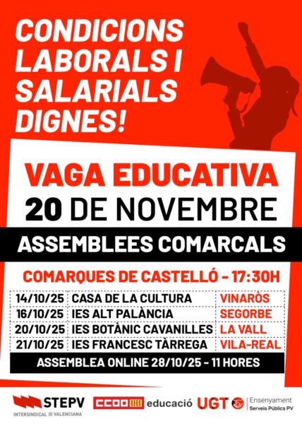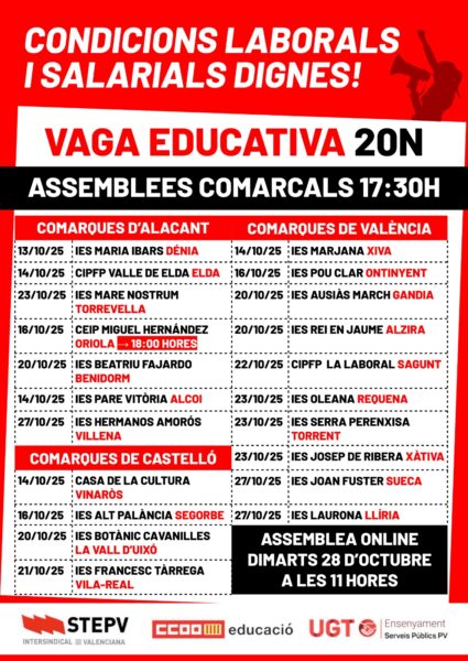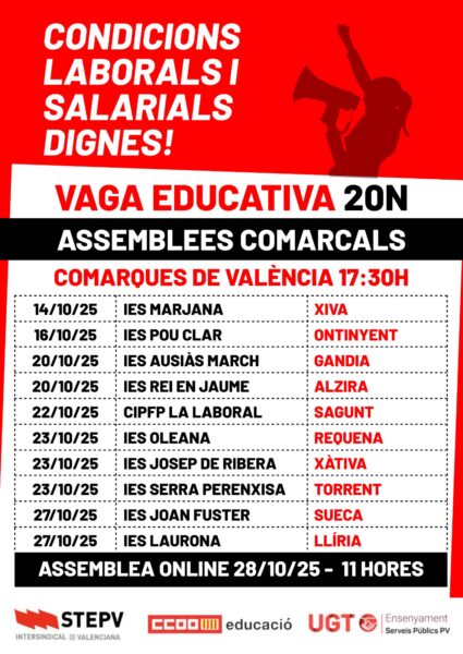 UGT, CCOO i STEPV fconvoquem assemblees comarcals presencials a partir del 7 d’octubre per tractar la proposta de mobilitzacions per millorar les condicions retributives i laborals del professorat i garantir una atenció de qualitat al nostre alumnat.