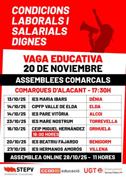 Després de les assemblees celebrades el 7 d’octubre a Alacant, Elx, València i Castelló, UGT, CCOO i STEPV continuen convocant assemblees comarcals presencials al llarg del mes d’octubre amb l’objectiu d’acordar un calendari de mobilitzacions i pressionar la Conselleria per aconseguir millores laborals i retributives del professorat. Aquestes assemblees són una eina clau per a reforçar la unitat del col·lectiu docent i garantir que la veu del professorat siga sentida en les decisions que afecten la seua feina i la qualitat de l’educació pública.