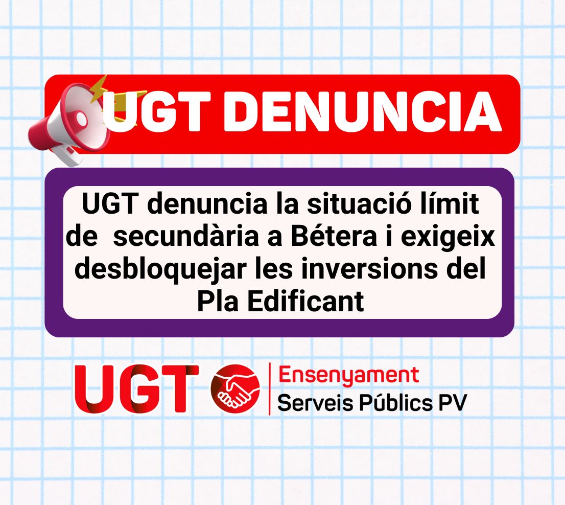 Davant aquesta situació, UGT Ensenyament PV exigeix a la Conselleria d’Educació i a l’Ajuntament de Bétera que desbloquegen de manera immediata les actuacions previstes dins del Pla Edificant, actualitzen el pressupost necessari per a executar les obres i establisquen un calendari clar i públic d’actuacions.