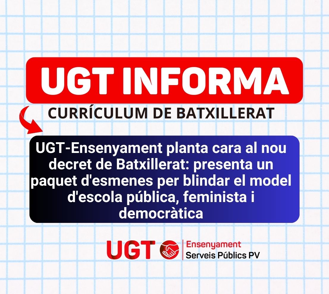 UGT-Ensenyament PV ha registrat oficialment un exhaustiu llistat d’esmenes al Projecte de Decret pel qual s’estableix l’ordenació i el currículum del Batxillerat. El sindicat considera que el text presentat per l’actual Conselleria d’Educació suposa un «retrocés ideològic» que posa en risc pilars fonamentals com la inclusió, la igualtat de gènere i la memòria democràtica.