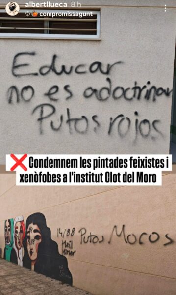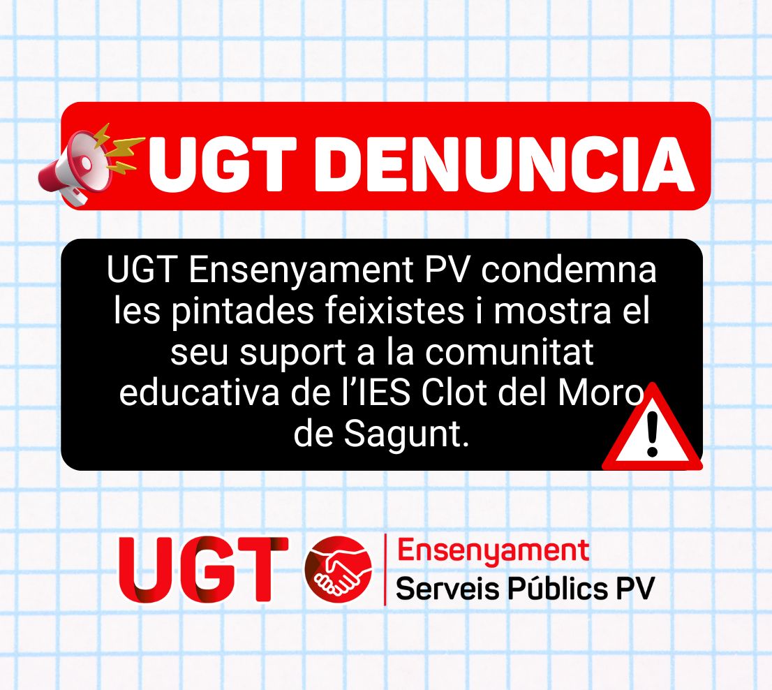 UGT Ensenyament del País Valencià manifesta la seua condemna més absoluta i rotunda davant les pintades amb amenaces de caràcter feixista aparegudes recentment a la porta de l’IES Clot del Moro de Sagunt, uns fets d’extrema gravetat que suposen un atac directe no sols a la comunitat educativa del centre, sinó també als valors democràtics, de convivència i de llibertat que sustenten l’educació pública.