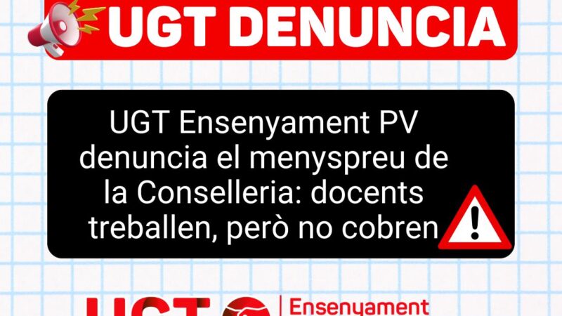 UGT Ensenyament PV denuncia el menyspreu de la Conselleria: docents treballen, però no cobren