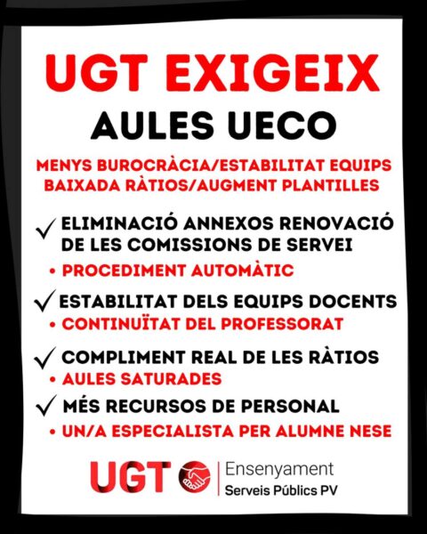 Davant aquest escenari, UGT planteja un conjunt de mesures urgents i imprescindibles. En primer lloc, reclama la reducció significativa de la burocràcia associada al funcionament de les aules UECO, especialment pel que fa als procediments administratius vinculats a les comissions de servei. En aquest sentit, el sindicat exigeix l’eliminació dels annexos en la seua renovació i la implantació d’un procediment automàtic que garantisca la continuïtat del professorat. UGT considera que l’estabilitat dels equips docents és un factor determinant per assegurar la qualitat educativa i el correcte desenvolupament dels projectes d’inclusió.