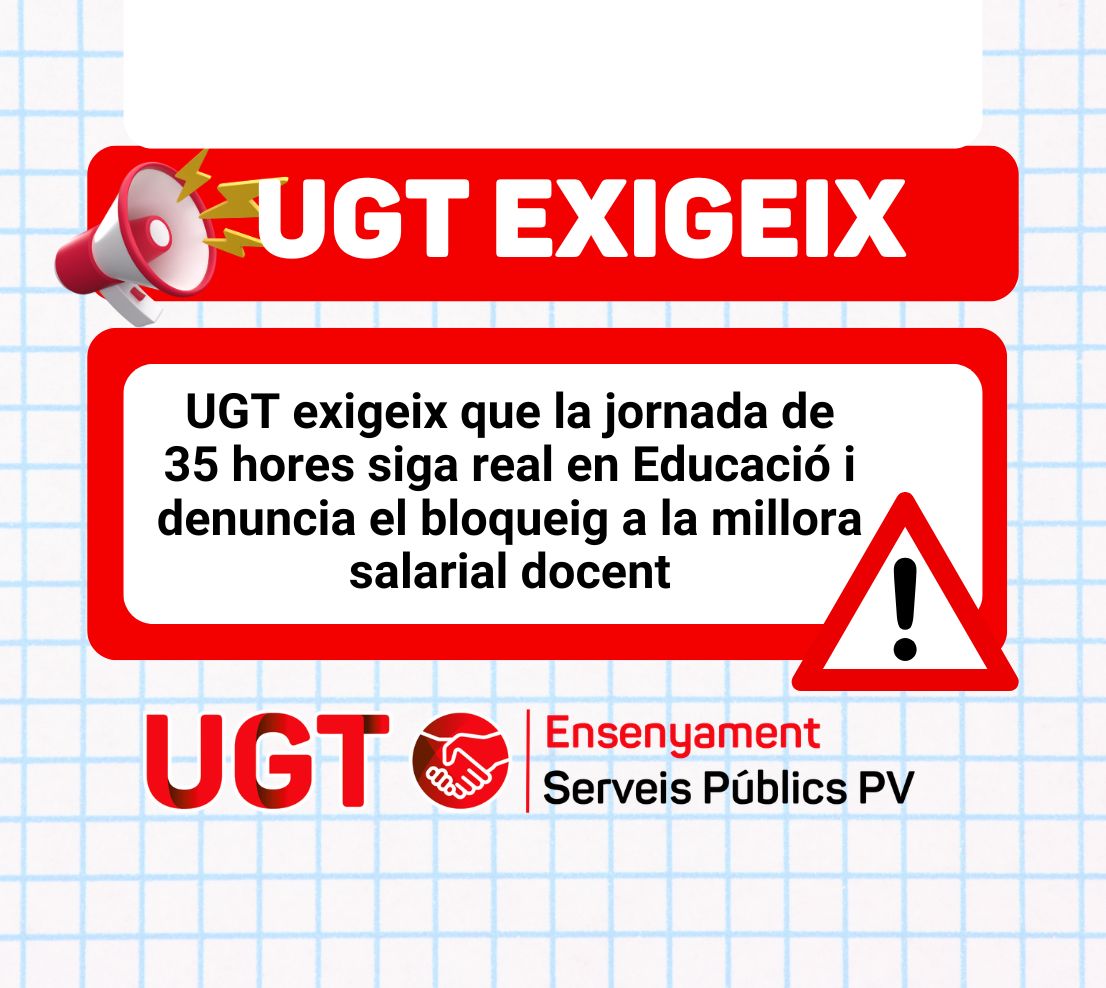 UGT advertix que este bloqueig dificulta la desescalada del conflicte educatiu, abocant el personal docent a la vaga educativa, i reitera la seua disposició a negociar un acord que garantisca tant l’aplicació real de la jornada de 35 hores com la millora de les condicions laborals del professorat.