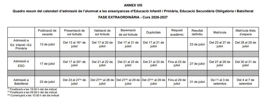 Calendaris d’admissió per a educació infantil, educació primària, educació secundària obligatòria i batxillerat