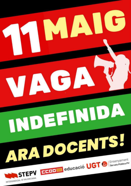UGT , STEPV i CCOO han registrat la vaga aquest matí a la Conselleria d’Ocupació i estan treballant les propostes d’accions que es tancaran aquesta vesprada. Les accions que majoritàriament van tindre més suport en l’assemblea van ser la convocatòria de manifestacions en els tres territoris i una gran manifestació a València ciutat, accions que ja s’estan gestionant, juntament amb altres mobilitzacions que s’anunciaran pròximament.
